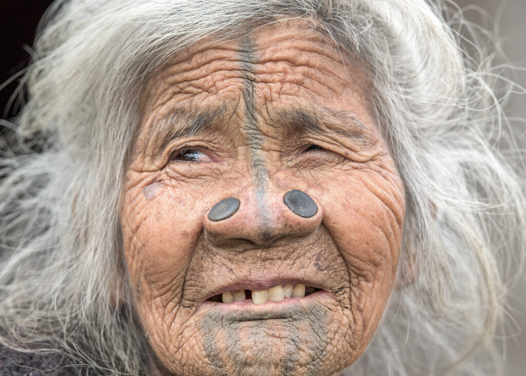 Im abgeschiedenen Tal des Apatani-Volkes im Nordosten Indiens glänzen die Gesichter älterer Frauen noch heute mit einem bemerkenswerten Schmuck: massive Holzpflöcken, die sich durch ihre Nasenflügel bohren. Über Generationen hinweg wurden sie getragen als sichtbares Zeichen von Zugehörigkeit, Stolz – und vielleicht auch als stiller Schutz. In früheren Zeiten war das Ziro-Tal, in dem die Apatani leben, umgeben von benachbarten Stämmen auf der Suche nach jungen Bräuten. Die Pflöcke, so wird erzählt, sollten die Frauen weniger attraktiv erscheinen lassen, damit Entführung oder Handel vermieden wurden. Diese Argumentation hörten wir auch bei den Frauen mit Gesichtstätowierungen in Myanmar. Gleichzeitig fungierten sie als Markierung. Wer sie trug, war Apatani, Teil einer Gemeinschaft mit höchster Achtsamkeit für ihre Felder, Feucht-Terrassen und seltenen Wasservögel. Die Gesichtstätowierungen, die viele Frauen zusätzlich trugen, verstärkten dieses Erbe. Linien über Wangen und Kinn erzählten von Wandel, Alter und Würde. Heute ist diese Tradition fast ganz verschwunden. Nur wenige ältere Apatani-Frauen tragen noch die Pflöcke – stille Zeuginnen einer Kultur, die sich wandelt im Angesicht von Internet und Mobilfunk und eine Erinnerung daran, wie eng Schönheit, Symbol und Überleben in dieser Berglandschaft verwoben waren. Wir hatten das Glück und konnten noch einige von ihnen fotografieren.